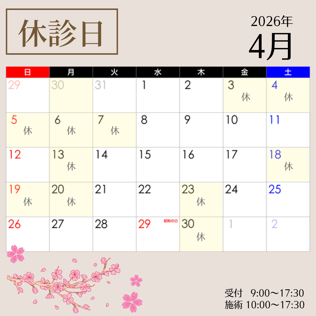 - 施術・患者様対応中など、お電話に出られない場合がございます。しばらくお時間をおいてお掛けなおし頂きますよう、ご協力お願い申し上げます。